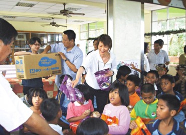 “加油,更要有自信!”周美青分送礼物时,不忘勉励小朋友。孩子拿了玩具爱不释手,应届毕业的卢峰豫急着要带回去给阿公看。