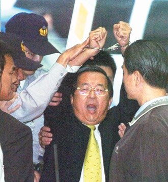 陈水扁学云林县长苏治芬高举手铐那一刻,前民进党主席施明德讽刺说,这是“东施效颦”。图片来源:台湾《联合报》