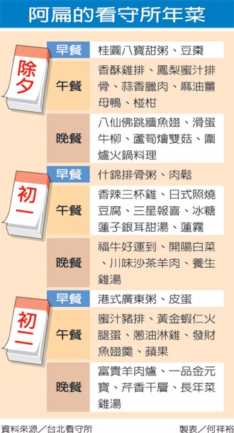 台北看守所指出,他们为不能回家过年的收容人在春节加菜,在除夕,陈水扁可以吃到的年菜,有八仙鱼翅佛跳墙、滑蛋牛柳、芦笋烩双菇、围炉火锅料汤等,还有香酥鸡排、菠萝蜜汁排骨、蒜香腊肉、麻 油姜母鸭汤及水果椪柑等。