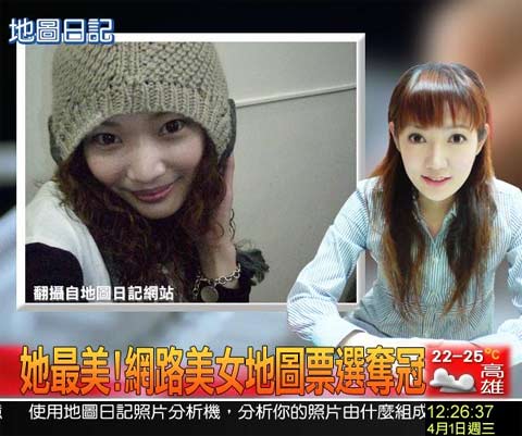“想知道谁是台湾最美的女性吗?地图日记网站日前举办美女票选,活动一个月就突破千万的浏览率…”,玄藏大学大三生刘伊珊一周前上传自拍照片,制成网络美女票选夺冠的头条新闻,没想到还成功骗倒两个同学。刘伊珊说,当初只是想给同学一个惊喜,竟还有同学看到之后问,“你真的上电视喔?”