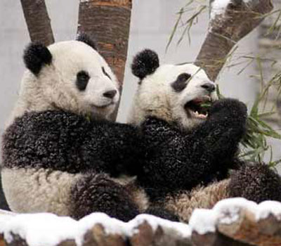 主持人:很快就要到农历春节了,我们大家都还记得,在去年的中央电视台春节联欢晚会上,大陆同胞赠送台湾同胞的一对大熊猫乳名被确定为“团团”、“圆圆”。如今,“团团、圆圆”的名字诞生快一年了,但是,对于台湾同胞来说,现在要想看到“团团”、“圆圆”,仍然要不远万里,到四川卧龙才能一睹它们的风采。这不,台湾TVBS电视台记者最近冒着风雪来到卧龙,用镜头记录下团团圆圆的生活情况,告诉岛内民众,两只可爱的大熊猫现在究竟长成什么样了。