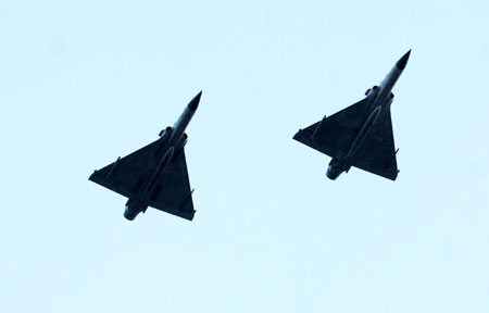 清晨六点二十三分,两架F-16战机首先飞越松山机场上空,接着依序是IDF、幻影2000,以及两架喷着彩烟的“雷虎小组”AT-3喷射教练机编队通过。