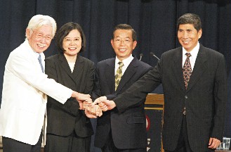 民进党五月十日举办党主席选举电视辩论会,三名候选人辜宽敏(左)、蔡英文(左二)、蔡同荣(右)一起与谢长廷合影。(台湾《联合晚报》图)