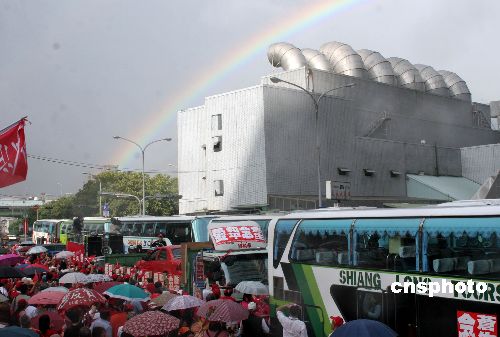 9月29日下午,台湾“百万人反贪腐运动”发起的“环岛遍地和平开花”行动正式启动。运动总召集人、前民进党主席施明德率领约四百名民众分乘二十辆游览车和数十辆小轿车,在隆隆鼓声中于台北车站列队出发。中新社发 黄少华 摄