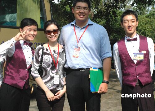 10月17日,中国国民党荣誉主席连战之子连胜文和情侣,参加海南博鳌两岸农业合作论坛期间,受到海南年轻人的欢迎,不断有工作人员邀请他们合影。中新社发 王辛莉 摄