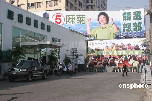 十二月九日,高雄市长选举就要正式投票,高雄市长选举竞争最激烈的是国民党藉候选人黄俊英与民进党藉候选人陈菊。图为陈菊的竞选总部与文宣广告。中新社发 耿军 摄