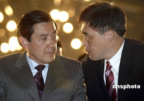 十二月十六日下午,由台北市文化局首次举办的“台北眷村文化节”正式开幕,台北市市长马英九和候任市长郝龙斌双双出席开幕式。眷村文化是台湾特殊时代背景下产生的独特的社区文化。图为马英九与郝龙斌在开幕式上交谈。中新社发 张炜 摄