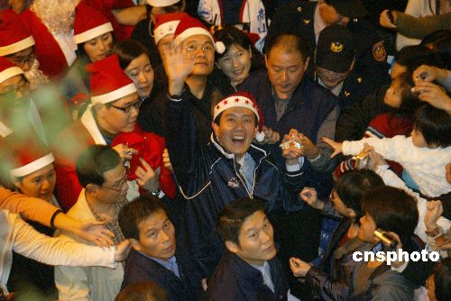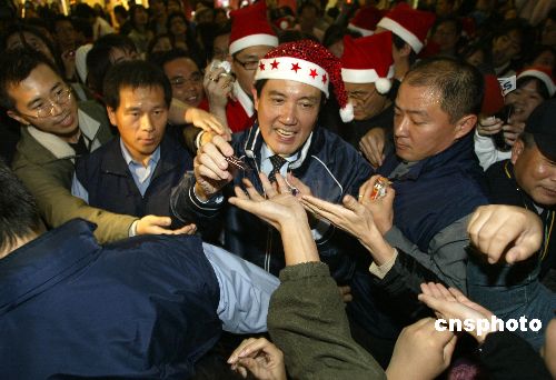 圣诞平安夜,台北市长马英九来到信义商圈街头与市民互动,并向市民派发糖果,祝福圣诞快乐,大批市民蜂拥而上。这是马英九市长任内最后一次公开活动。二十五日,马英九市长将正式卸任。中新社发 张炜 摄