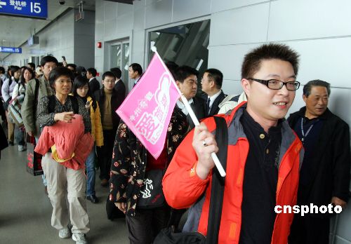 二月十三日上午九时五十分,二○○七年首班两岸春节包机——自台北飞来的台湾华信航空公司AE八七一航班,顺利抵达上海浦东机场。 机上搭载着二百三十一名乘客,其中包括一百六十余人组成的台胞观光团。 这些旅客中,既有来上海与家人团聚在沪过年的,也有借“包机”之便来江南旅游的。中新社发 汤彦俊 摄
