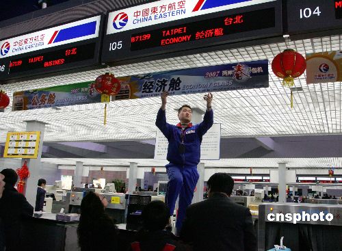 二月十四日八点三十分,随着东航世博号A340-600飞机首次执行两岸春节包机重任,从上海起飞赴台北,拉开了两岸春节包机上海航点繁忙的序幕。据悉,今年,上海浦东机场往返台北或高雄机场的航班有一百架次,将创下海峡两岸开通春节包机以来,上海航点承接的包机数量之最。但是,这还不能满足台胞需求,大部分台胞仍希望包机能再“多多益善”。中新社发 潘索菲 摄