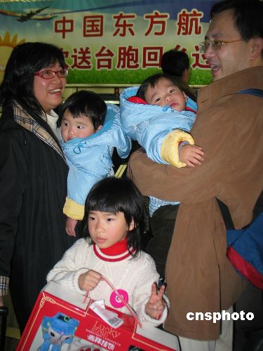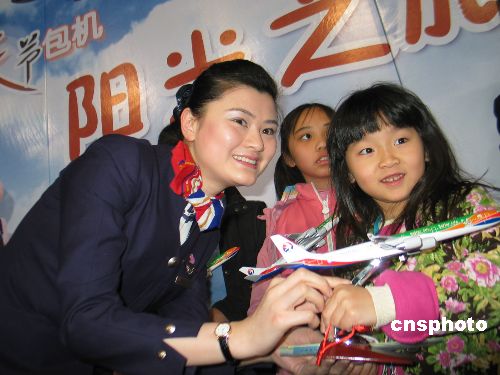 2007年2月14日上午,以“阳光之旅、相约世博”为主题的东航2007年两岸春节包机顺利起航。上海的首批台胞乘着东航世博号飞机,高高兴兴回家过年。此次东航包机特别推出“寻找阳光小旅客”的活动,分别为30名2-12岁的儿童旅客授予了“阳光小旅客”的称号。同时,东航还幸运找到了2005年也乘坐过东航首班两岸春节包机的小旅客。中新社发 陈焕联 摄