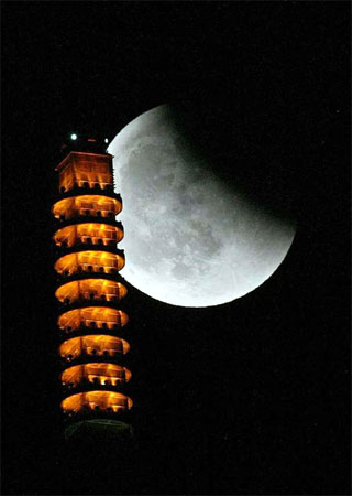中新网8月29日电 据台湾《中国时报》报道,今年第二次的月全食二十八日现身台湾夜空,由于月亮于傍晚升起,所以台湾地区仅能见到从食甚到复圆的月全食后半过程,称为“月出带食”,月亮并无全黑。图为月食与台北市地标101大楼擦身而过,形成的美丽夜景。(黄国书)