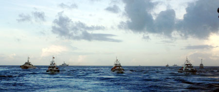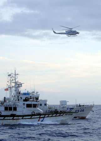 台湾保钓人士以海钓船前往钓鱼岛宣示“主权”,十六日清晨当保钓船只接近钓鱼岛海域时,台湾巡防艇(前)与日本保安厅巡逻艇(后)相互对峙,不让日本船只接近保钓船,空中还有日本直升机沿途监视。整个钓鱼岛海域布满双方海防舰艇,情形紧张中相互又颇节制。“中央社”图