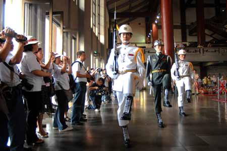 两岸周末包机四日启动,广州首发旅游团抵台后即前往台北“国父纪念馆”参观,正好看到三军仪队表演,感到很兴奋,手中相机拍不停。