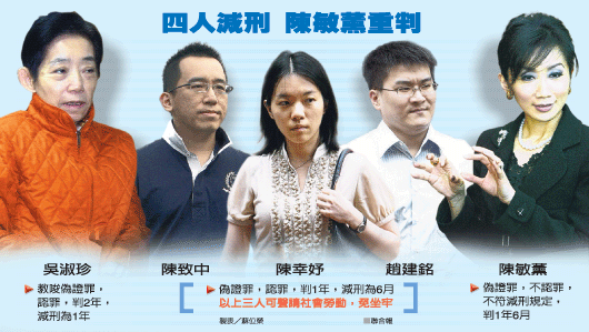 中新网9月2日电 据台湾《联合报》报道,陈水扁女儿陈幸妤、女婿赵建铭、儿子陈致中因伪证罪被判刑六月,虽不能易科罚金,但可以易服社会劳动。检方表示,未来原则上会核准赵建铭、陈幸妤声请义诊替代服刑,但法律劳务暂不需要,因此陈致中可能被安排清洁小区。