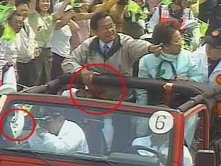 后来确认是中枪,送到病房之前,在急诊室里,吕秀莲在旁边掀了掀布帘要和陈水扁讲话,“她说:绝对是她先中枪,然后我才中枪,而我中的那枪,是打中她的子弹反弹到我身上来的,所以我才会受伤。”陈水扁说,他告诉吕秀莲不要随便乱讲,“我知道的不是那样,而相关人员向我做的报告也不是如此。”当时他穿了三层衣服,夹克、衬衫和内衣,他的右侧,三层衣服都有子弹的穿入的痕迹,而靠近吕秀莲的左侧,只有内衣与衬衫有穿孔,夹克则没有。