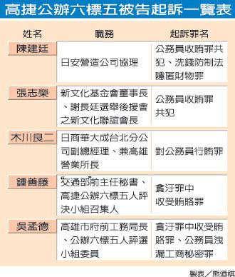 据台湾《联合报》报道,一年多前被依背信等罪起诉的捷运六标评决小组主席钟善藤(前“交通部”主任秘书)与委员吴孟德(前高雄市工务局长)被检方查出分别收受300万、200万元贿款,一并移送“地院”审理。钟善藤在侦查中坦承收贿;吴孟德承认收受200万元,但否认是贿款;木川良二也否认行贿。