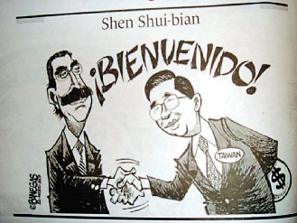 据香港大公报引述的报道,洪都拉斯当地媒体《新闻报》日前刊登一幅漫画,画中,洪都拉斯总统赛拉亚趾高气扬,陈水扁则弯腰笑着和赛拉亚热情握手,背后还提了袋钱。上头的西班牙文,则是“欢迎”之意。不管漫画作者是要讽刺该国总统死要钱,还是在嘲讽台湾根本是个“外交凯子”,而这两种意向皆已透过简单传神的漫画表达出来。