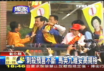 当天上午,马英九走出彰化县“立委”候选人陈秀卿竞选总部时,身上已经穿了竞选背心。但他最信任的贴身随扈,却拿着另外一件竞选背心等在吉普车上。马英九一上车,随扈立刻帮他换上这件背心,马英九的表情看起来不太情愿,但还是勉强穿上。