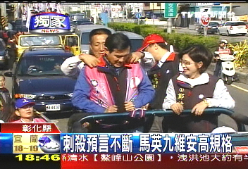 这一阵子马英九所到之处,总是防弹公文包、防弹盾牌贴身护卫。尤其是在上个星期六,马阵营接获通知有人要在嘉义刺杀马英九,安全人员立刻进入红色警戒。