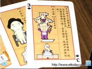 而“黑桃三”的杜正胜,不仅头上顶着“三只小猪”,拿着“正名”、“成语”、“胡诌”三个牌子,脚下写着“罄竹难书”和“音容苑在”两句成语,旁边再批:“儿子有特权当凉兵,官邸当夜店有辣妹。‘故宫’扩建案搞八亿。歪哥疑云,检调不排除约谈。”