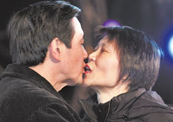 中新网2月15日电 据台湾中国时报报道,常给人酷酷形象的周美青,一直未在“大选”时出面助选,十四日情人节晚上首度和马英九同台,两人三度拥吻,合唱“今天你要嫁给我”,还感性推销马英九虽不懂人情世故,但正直、善良、敦厚、温和、认真、负责。