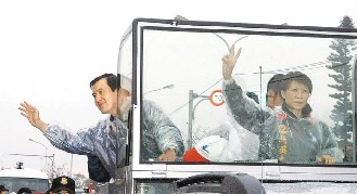 国民党候选人马英九18日上午与夫人周美青一起在新竹市冒雨扫街拜票。(图:台湾《联合晚报》)