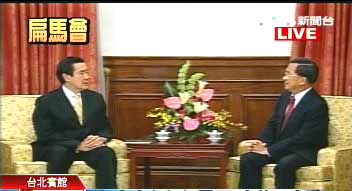 在陈水扁邀请下,马英九今天上午10点半在台北宾馆会面,双方展开3对3的会谈。
