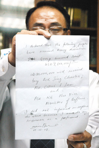 中新网5月8日电 台当局“金援丑闻案”中间人吴思材的律师徐景星,7日公开吴思材在收押前留下的“保命信”,对先前的说法大翻供,律师称吴思材手写的“洗钱分配流程”,两千九百八十万美元是汇回台湾给官员。