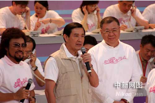 5月18日晚,马英九和夫人周美青参加当地电视台和红十字会等为四川赈灾募款的“把爱传出去”晚会。