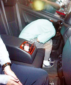 台湾检方特侦组14日提讯在押的前陈水扁任内办公室出纳陈镇慧及陈水扁办公室主任林德训厘清案情;陈镇慧还押看守所时在车内弯腰闪避媒体镜头。(图:台湾《中国时报》)
