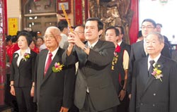 台湾基隆市天显宫主祀的伍显大帝26日圣诞,马英九参拜时,呼吁台民众相信“政府”,携手度过金融风暴。(图:台湾《中国时报》)