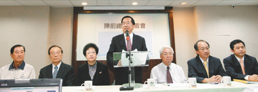 陈水扁(中)10日晚临时举行记者会,拿出传票预言自己一定会被押。包括台当局前“副总统”吕秀莲(左三)、前“行政院长”张俊雄(左二)、前“总统府秘书长”陈唐山(左一)、民进党“立院”党团总召柯建铭(右二)、律师郑胜助(右三)与郑文龙(右一)都出席这场记者会。? onkeypress=