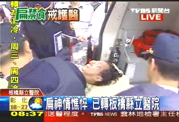 中新网11月17日电 经过16日一夜观察,陈水扁血糖、血压目前已渐趋稳定。基于戒护需要,17日上午,台北看守所将陈水扁转往台北县立板桥医院,持续进行观察。板桥医院表示,将安排六位医生会诊,初步观察陈水扁生命状况稳定,院方将持续进行保守性治疗,并劝说其进食。