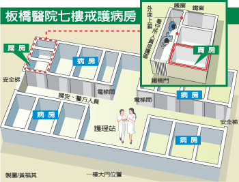 板桥医院的戒护病房虽然没有窗户,但因是中央空调,不至于有空气无法流通问题。虽然戒护病房里都备有手铐脚镣等戒具,但并未使用。