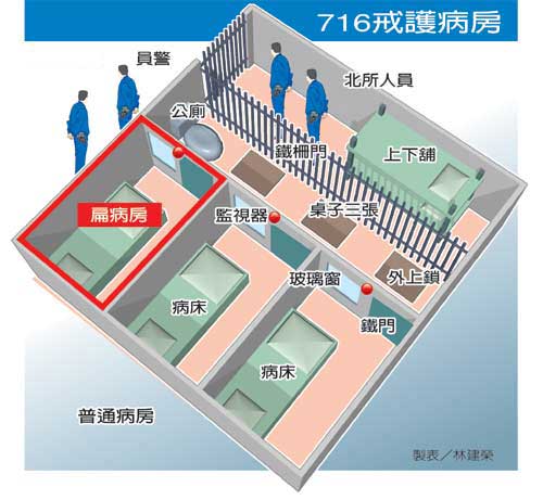 板桥医院戒护病房是将七一六号病房另设门户,在走廊尽头设置一道电动玻璃铝门隔开,另以两道铁栅门将内部隔出看守所人员休息区、戒护区,其余空间再分隔成三间每间不到两坪大的单人房,每间单人房的铁板门自外上锁,看守所人员可从墙面的一道玻璃窗察看,每间小病房天花板都有一座监视器。