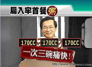 中新网11月28日电 据台湾“今日新闻”报道,身陷洗钱疑云的陈水扁遭收押后即以禁食抗议,不过,昨天(27日)晚间已恢复进食,不但喝了500毫升的粥,还吃了一颗水煮蛋。国民党“立委”邱毅讽陈水扁说,别一口气吃太多,以免“泻肚”。