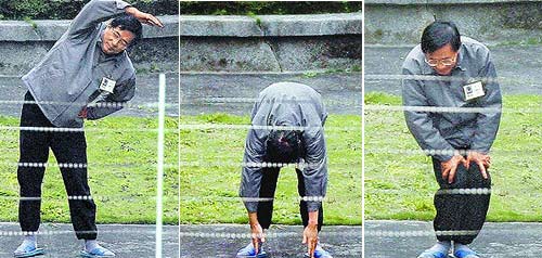 接着扁开始抬腿、散步暖身,还向记者打招呼,然后扁开始抬膝盖、双手上下左右伸展;扁双手向上举时一度停了一分半钟,还脸带笑意朝记者望去,似乎故意要摆给记者看。