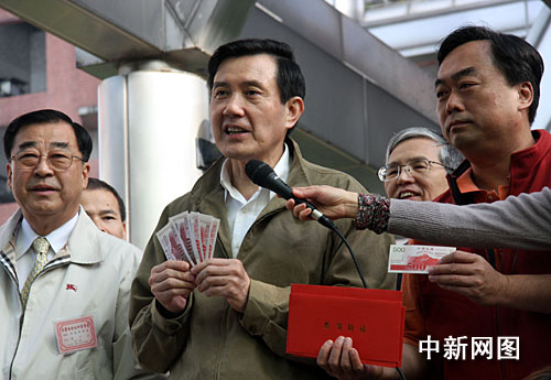中新网1月18日电 据台湾TVBS报道,台当局为了拼经济,在今天(18日)发放3600元新台币的消费券,而身为家中户长的马英九,今天上午代表马家人前往,户籍地附近的发放所,领取消费券。