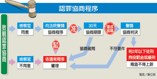 何谓“认罪协商”?简单说就是被告认罪后,与检察官、法官针对罪名、刑度等相关事项进行协商的刑事诉讼制度。在认罪协商程序中,被告须与检察官协商罪名、刑度后,向法院陈报,经法院同意下开庭制作“协商笔录”,即完成协商程序,案件就不能再上诉,宣告定谳。不过,公诉检察官在与被告协商前,必须先征询侦查检察官的意见,甚至还要经检察长批示准许后,才能实施。