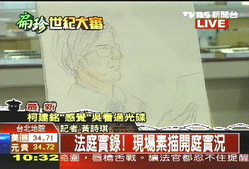 而在法庭内的素描,坐在被告席上的陈水扁看来有些驼背,面前摆着一台计算机,所有对话都会在计算机中显现出来,在被告席左边的是律师席,坐着陈水扁律师郑文龙,而被告席正对面就是审判者蔡守训,蔡守训一开始问陈水扁是不是心跳加速、会气喘?陈水扁连话都没有说,只是点点头,低头看着计算机屏幕。