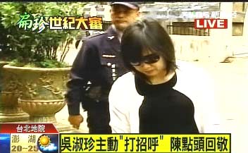 中新网3月17日电 据台湾“今日新闻”报道,陈水扁夫人吴淑珍17日下午出庭与扁家大账房陈镇慧就机要费案进行大对质,两人先后抵达法院。吴淑珍好精神、好气色,而陈镇慧则是相对显得低调和紧张,一出场就被一派轻松的吴淑珍给比了下去。