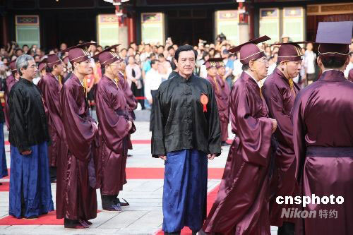 晨六时,天放亮,“鼓三严”,祭典依旧制开始。着褐色古袍的引领人员引领“主献官”台北市长郝龙斌及“分献官”、“陪祭官”等入场,郝龙斌及作为“分献官”、“陪祭官”的十几位台北优秀教师和各界代表,着蓝色长袍,黑色马褂,依次走向固定位置伫立。