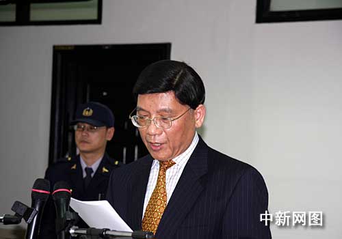 一月七日中午,台湾高等法院驳回陈水扁对二度遭到羁押的抗告,高院认为陈水扁委任律师所提抗告没有理由,因此予以驳回。全案就羁押部分不得再提抗告。图为台湾高等法院发言人温耀源在记者会上宣布裁定结果并解释裁定书。 (图文/中新社记者 陈立宇)