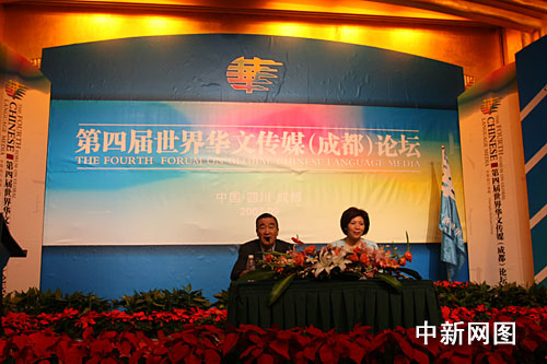 9月4日上午8时30分,第四届世界华文传媒论坛大会举行“部长论坛”。中国奥委会主席、北京奥组委主席助理屠铭德先生;北京市新闻办主任、北京市奥组委新闻宣传部常务副部长王惠女士正在为大家讲述奥运。中新社 郭晋嘉 摄。