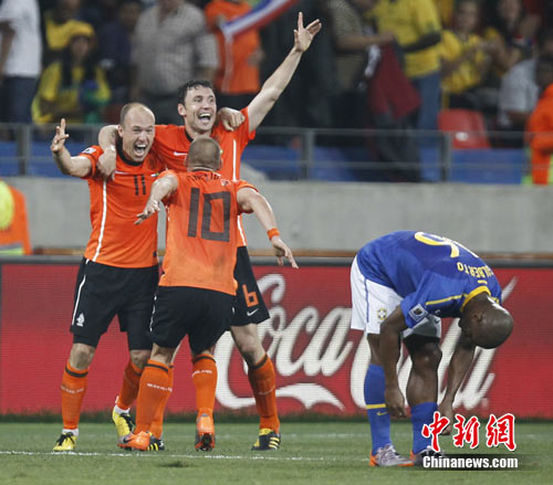 中新网7月2日电 今晚22:00,南非世界杯进行了1/4决赛的首场比赛,由荷兰队在伊丽莎白港的曼德拉湾球场迎战巴西。虽然罗比尼奥在上半场率先破门,但下半场凭借梅洛的乌龙球和斯内德头槌建功,荷兰队2-1逆转击败巴西队,率先挺进四强。
