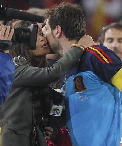 比赛结束后,身为体育主播的卡西美艳女友自然要采访西班牙的功臣,访谈结束后,她在众目睽睽之下现场为圣卡西送上香吻。