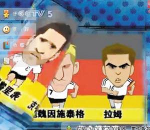 帖子里,这位网友贴出了很多自己为世界杯做的人物漫画。记者看了下,这些卡通版的运动明星主要是来自德国队、荷兰队、西班牙队、葡萄牙队、法国队、巴西队等的足球明星。漫画的背景是这些国家的国旗,人物线条尽管简洁,但非常有趣。该网友还提供了一个央视官网的视频链接,指出是央视在7月11日世界杯决战前的一档名为《全景世界杯》栏目里,未经授权使用了大量德国队队员卡通形象的漫画。