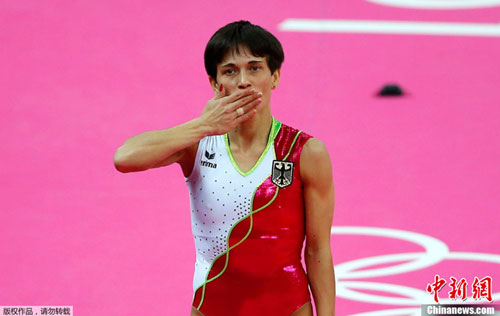 君请看,伦敦奥运会体操馆内朝气蓬勃,在各种器械上闪转腾挪的都是稚气未脱的少男少女。但跳马决赛中的一位白衣女子却与这里的“气场”十分不符。她就是代表德国参赛的丘索维金娜,现年37岁。