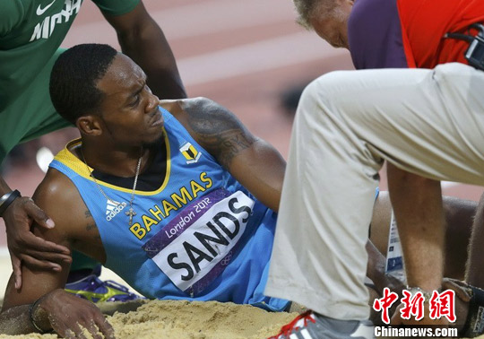2012年伦敦奥运会田径三级跳远决赛中,巴哈马选手桑德斯在助跑时发力过猛,结果摔倒在沙坑里。慢镜头回放显示,桑德斯的膝盖在着力的一瞬间突然脱臼,膝盖处明显变形,最终无法自主行走的桑德斯被工作人员用担架抬出了场外。